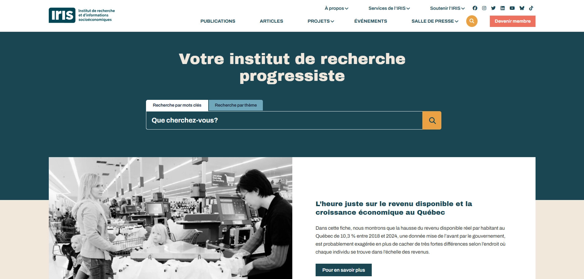 Site de l’Institut de recherche et d’informations socioéconomiques. J’ai travaillé sur la mise en place des différents moteurs de recherche, la structuration des répertoires et sur une partie de l’intégration, afin de faciliter la navigation et l’accès aux publications et données par thèmes et mots-clés pour les utilisateurs.